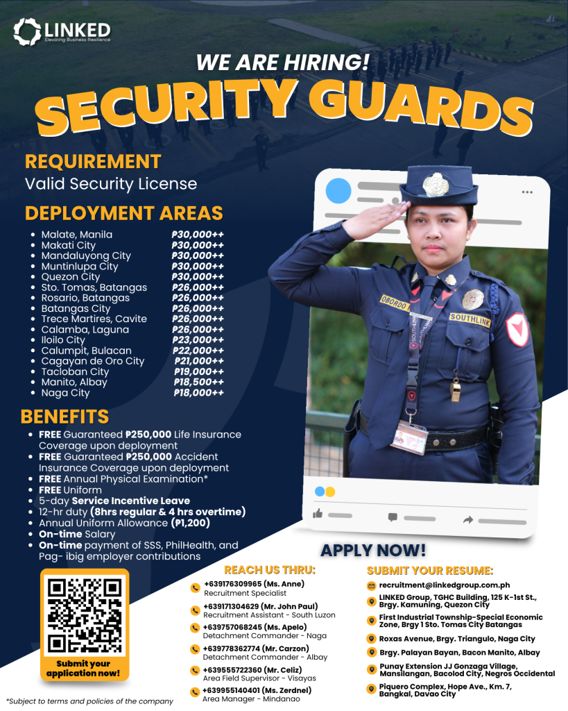 Successful applicants will be assigned to key locations including Metro Manila, Batangas, Cavite, Laguna, Iloilo, Bulacan, Cagayan de Oro, Tacloban, Albay, Naga, and Davao. Competitive salary packages are offered depending on the area of deployment, ensuring fair and region-based compensation. In addition to competitive pay, LINKED Group provides a comprehensive benefits package that supports both personal and professional well-being. These include life and accident insurance coverage upon deployment, free annual physical examinations, and provision of uniforms. Employees are also entitled to service incentive leave, annual uniform allowance, and a structured 12-hour duty schedule with corresponding overtime pay.