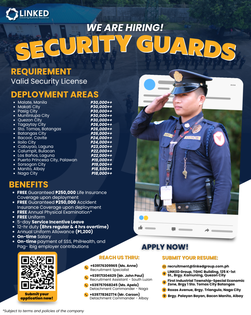 This recruitment drive reflects the organization’s ongoing commitment to delivering dependable security services while providing stable employment opportunities nationwide. Interested applicants are encouraged to submit their resumes through the provided contact channels and take the next step toward a rewarding career as Licensed Security Guards with the LINKED Group.